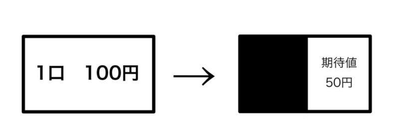 1口100円で購入したとすると期待値は50円という事になります。100円を支払って50円になる確率が高い権利を購入していると言い換えることができます。期待値が半分程度になる不利な賭けでもあなたはお金持ちになれると信じて買いますか。
