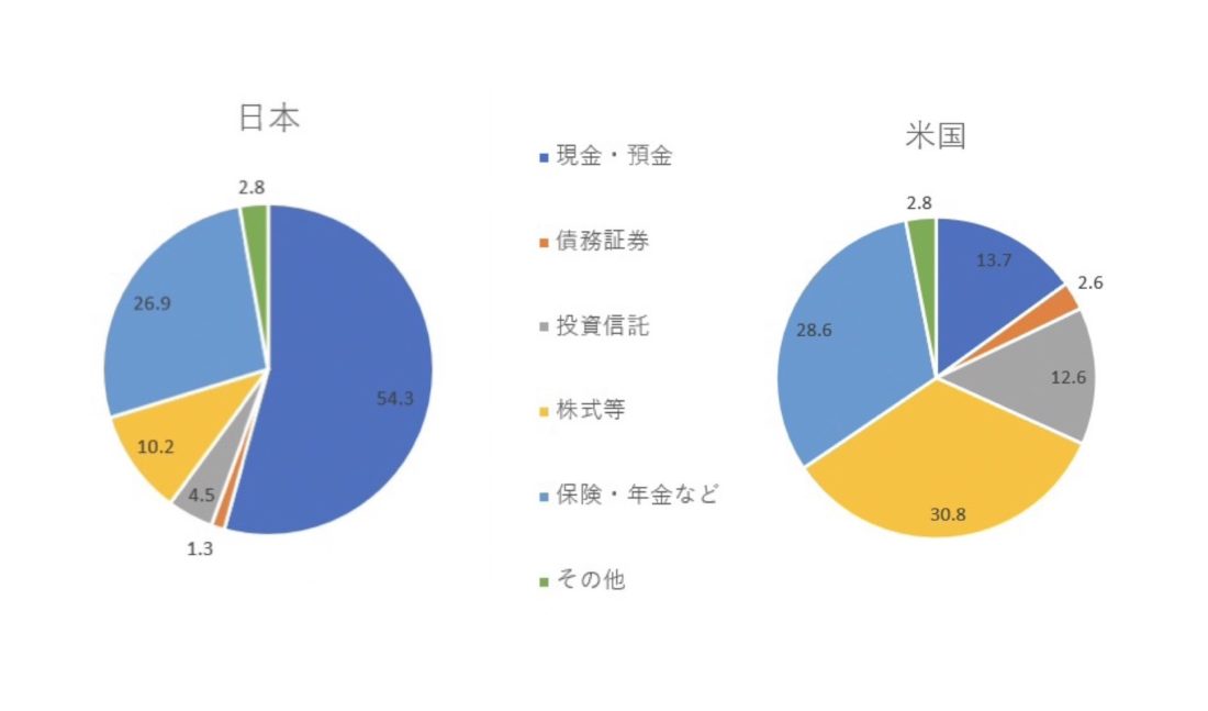 さらに日本とアメリカでは保有する金融資産割合に大きな違いがハッキリと判ります。下の図をご覧ください。